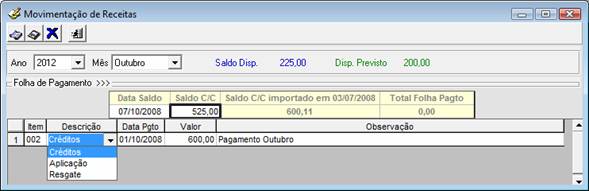 - Saldo Disp: (Saldo disponível): Será exibido o valor disponível, ou seja, será o valor restante entre o Saldo C/C e as Despesas não Pagas. (Cadastro de Despesas)