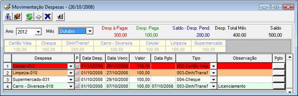 - Vermelha: Despesa venceu e não foi paga (Data pgto não preenchida)